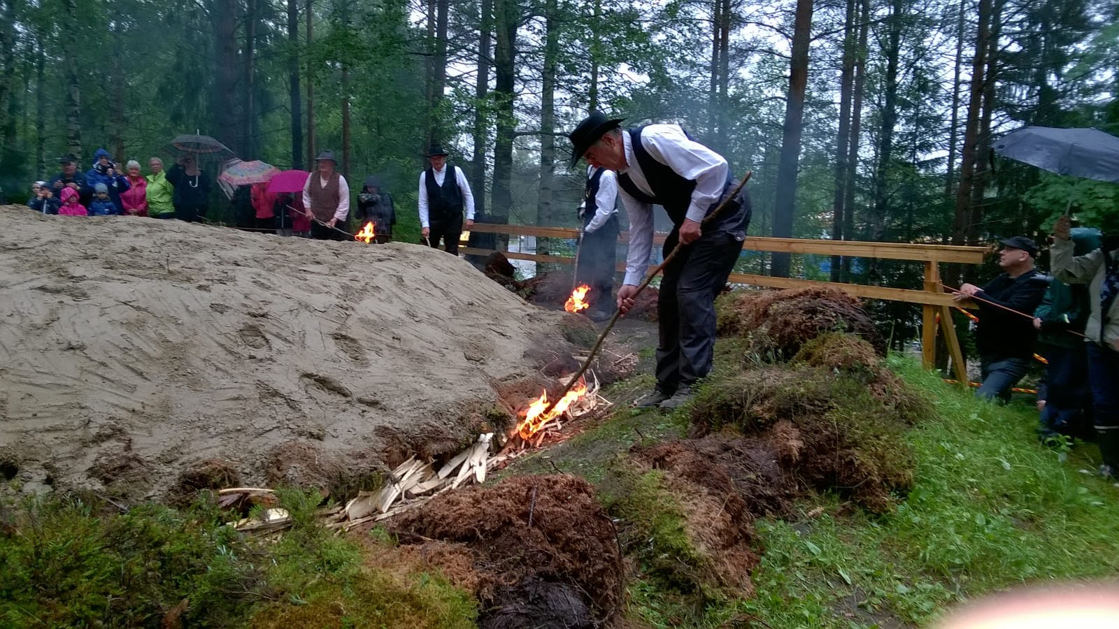 Olimme myös aktiivisia, kun aiemman paanuprojektin tuotoksiin, kirkon kattoon, piti saada tervaa. Siksi täytyi polttaa tervahauta.