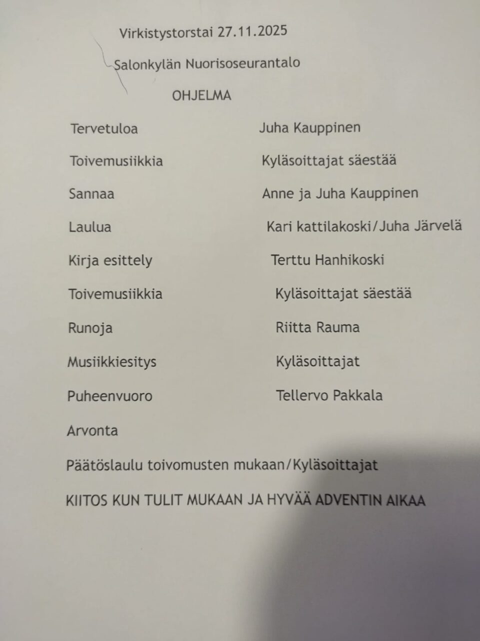 Kari Kattilakoski lauloi Juha Järvelän säestyksellä kaksi laulua: Konstan joululaulu ja Tuli kirkkoon mies ja lapsi.